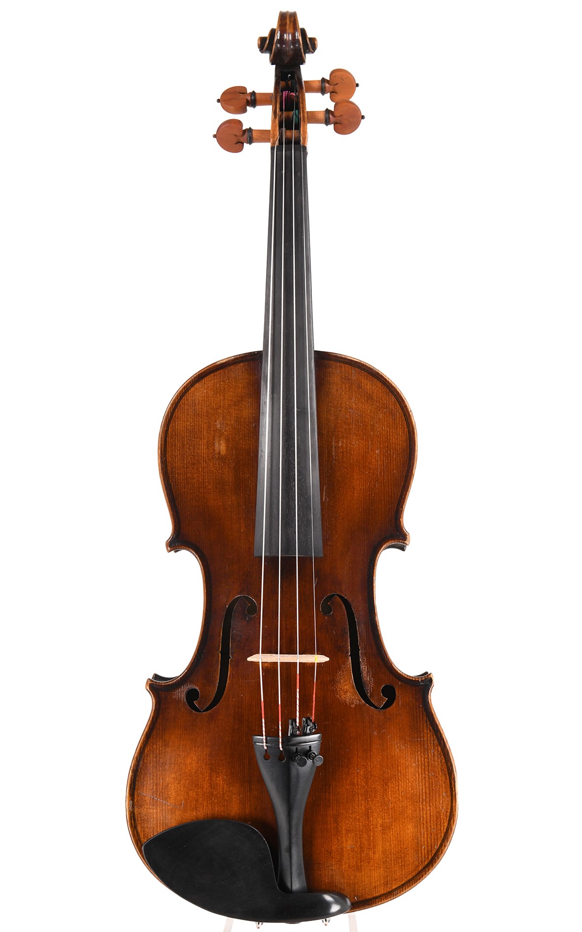 Alte deutsche Geige, die in den 1920er Jahren in Markneukirchen, wahrscheinlich in den Werkstätten von Schuster & Co. gebaut wurde. Die Violine ist ein gutes Beispiel für die hohe Qualität, der Schuster & Co.-Instrumente ihren bis heute guten Ruf verdanken: Eine qualitative Handarbeit mit betont flacher Wölbung, charakteristischen F-Löchern und einem sehr ansprechenden Lack von leuchtend hellbrauner Farbe. Spielspuren und kleine Makel am Lack beeinträchtigen die kraftvolle Klangqualität der antiken Geige in keiner Weise. Unsere Geigenbauer haben diese gute deutsche Geige sorgfältig aufgearbeitet und spielfertig gemacht - ihr heller Klang ist reif und klar, obertonreich und kräftig.