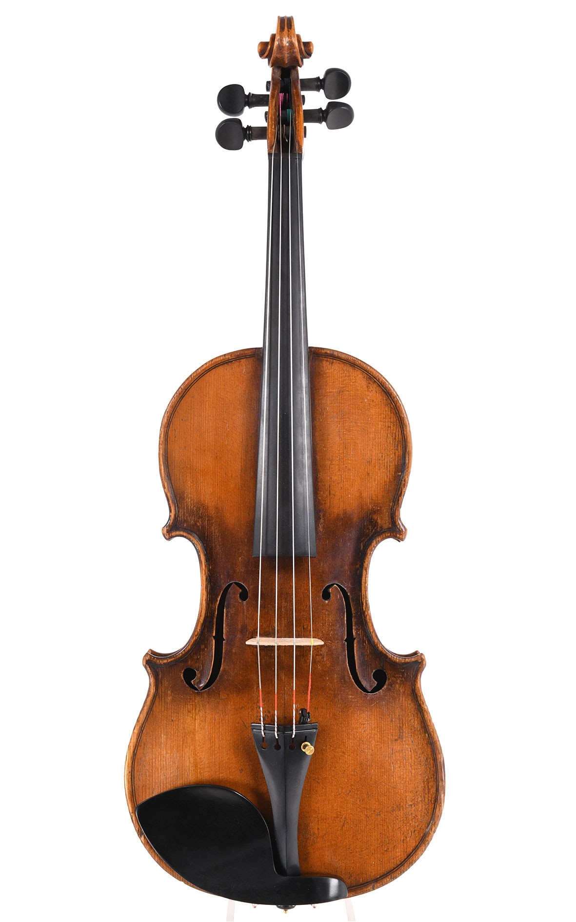Kaum zwanzig Jahre trennen Nicolas Augustin Chappuy und Didier l‘Ainé Nicolas, und doch stehen diese beiden einflussreichen Geigenbauerpersönlichkeiten für unterschiedliche Epochen der Geschichte des Instrumentenbaus in Mirecourt: Während l‘Ainé als der Begründer des Manufakturwesens, ja des industriellen Geigenbaus in seiner Heimat gilt, repräsentiert Nicolas Augustin Chappuy das traditionelle Handwerk – dessen Möglichkeiten er aber in seiner florierenden Werkstatt mit sicherem Gespür für den Markt neu definierte. Die hier angebotene seltene 7/8 Geige ist ein gutes Beispiel für die Konzentration auf das Wesentliche, die eine wichtige Grundlage seines Erfolgs war. Als späte Arbeit, die im späten 18. Jahrhundert wenige Jahre vor seinem Tod entstand, zeigt diese 7/8 Geige wie Nicolas Augustin Chappuy exzellente Klangeigenschaften auch mit kleineren baulichen Standards wie bei dieser Geige zu erreichen verstand – ohne auf den individuellen Charakter seiner qualitätvollen handgefertigter Geigen zu verzichten, der sich bei dieser Violine etwa in dem akzentuierten, breiten Rand und der ausdrucksstarken Schnecke artikuliert. Mit einem Anschäfter der Schnecke und einem andernfalls guten, mit einigen Reparaturen alten Wurmbefalls wie sie bei Instrumenten dieses hohen Alters nicht üblich sind, befindet sich diese seltene Chappuy 7/8 Meistergeige durchgesehen und aufgearbeitet in unserer spezialisierten Geigenbauwerkstatt, in bestem, sofort spielfertigem Zustand und verfügt über das ganze Potenzial ihres großen, kraftvollen und gereiften Klanges, der professionellen Ansprüchen genügt. Wie alle unsere Streichinstrumente und Bögen versandkostenfrei geliefert, mit 30 Tagen Rückgaberecht, optionalem Zertifikat und Corilon's Inzahlungnahmegarantie.