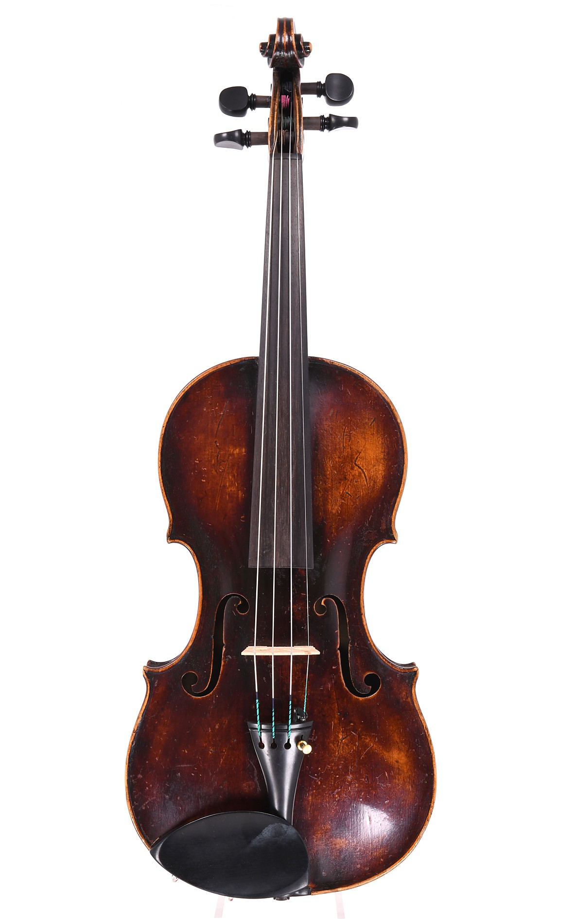 Diese feine Mittenwalder Geige ist ein ausgesprochen hübsches antikes Instrument, das von einem erfahrenen Meister aus der weitverzweigten Geigenbauerfamilie Hornsteiner geschaffen wurde – wahrscheinlich von Peter Hornsteiner, wie der renommierte Stuttgarter Experte Hieronymus Köstler in seinem Zertifikat annimmt, das wir der Geige beilegen. Sowohl die charaktervolle, ausdrucksstarke Ästhetik dieser exzellenten, handwerklichen Arbeit als auch ihr hervorragender, im Laufe der Jahre gereifter Klang reflektieren das hohe Niveau des traditionellen Mittenwalder Geigenbaus um die Wende zum 19. Jahrhundert, der sich ungeachtet der in dieser Zeit aufblühenden industriellen Musikinstrumentenproduktion behaupten konnte. Zu seinen Grundlagen gehören nicht zuletzt die erstklassigen regionalen Tonhölzer, wie sie sich im geheimnisvollen Farbspiel des tiefroten, stark ausgedunkelten Lackes dieser Geige zu erkennen geben: So stehen die engjährige Fichte der Decke und der breit geflammte Ahorn des zweiteiligen Bodens für das sichere Stilempfinden des Meisters und sein hochentwickeltes Bewusstsein für die Schwingungseigenschaften des Materials. Mit der individuellen, liebevoll geschnitzten Schnecke hat er dieser Geige eine persönliche Note verliehen, die ihrem edlen und farbenreichen Klang ausgezeichnet entspricht – eine dunkle, aber durchweg klare Stimme, mit der sich das sehr gut erhaltene, sofort spielfertige Instrument nach einer vollständigen Durchsicht in unserer Werkstatt empfiehlt.
